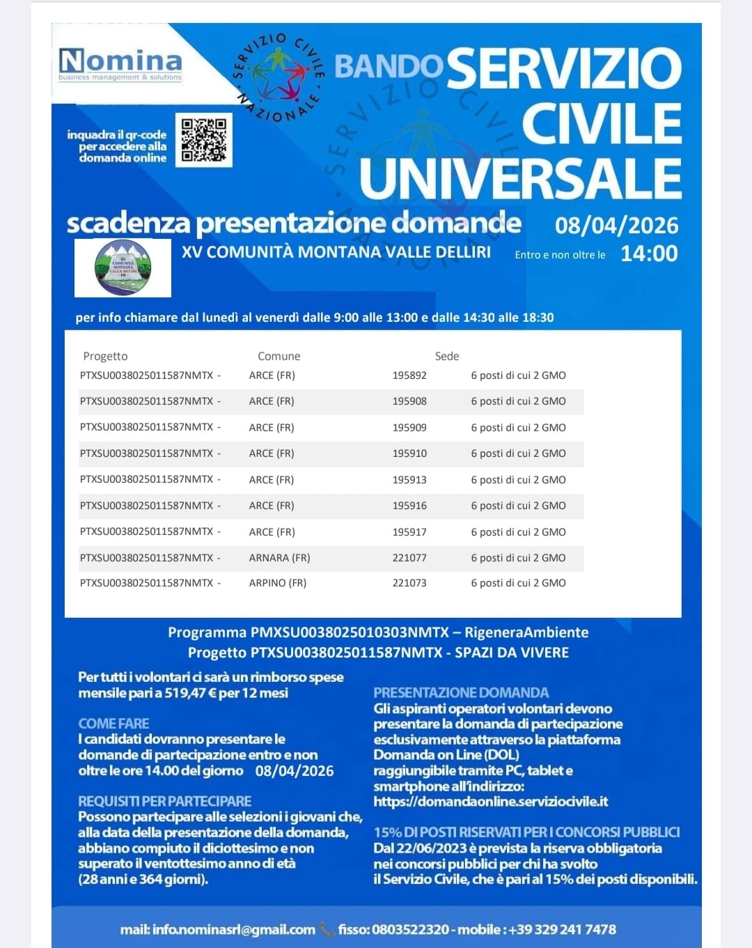 Bando Servizio Civile Universale scadenza presentazione domande 08.04.2026 ore 14:00.